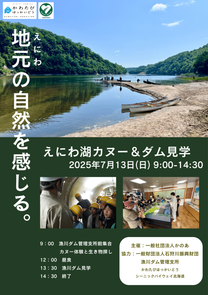 カヌーに乗って生き物探しをしたり、ダム管理支所の職員さんからお話を聞いたり、恵庭市の暮らしを守るえにわ湖(漁川ダム)への理解が深まった1日の様子をぜひご覧ください。
