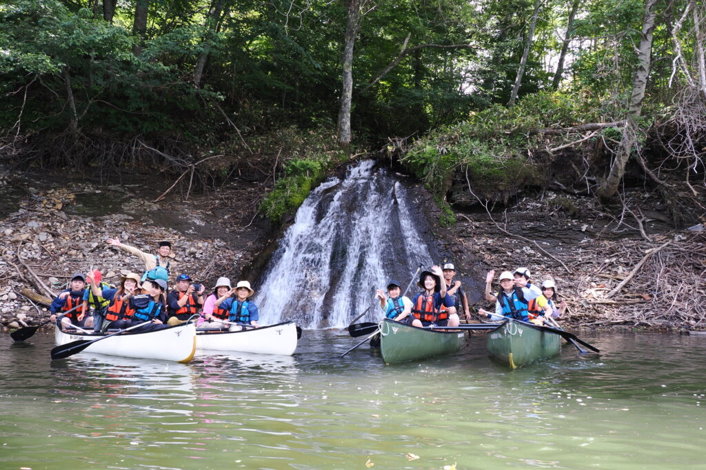 滝の近くまでカヌーを寄せ、滝の飛沫を浴びたり、カヌーから降りて滝の水に触れたりする子どもたちもいました。